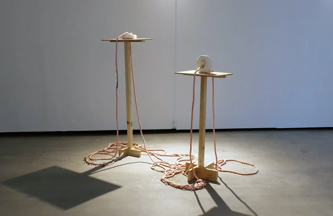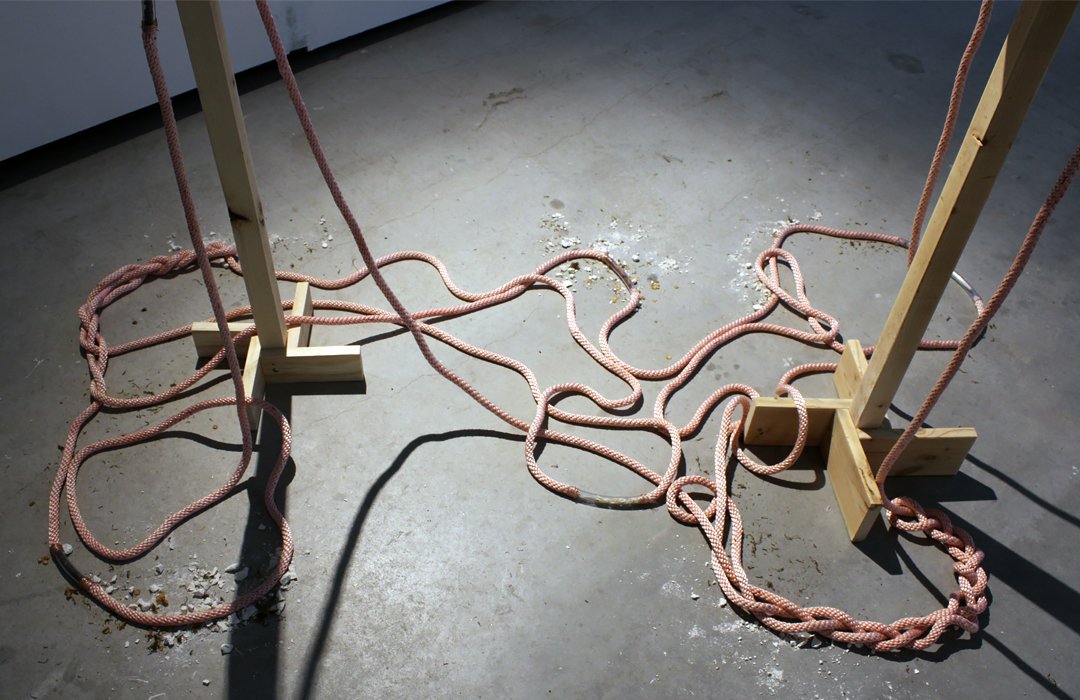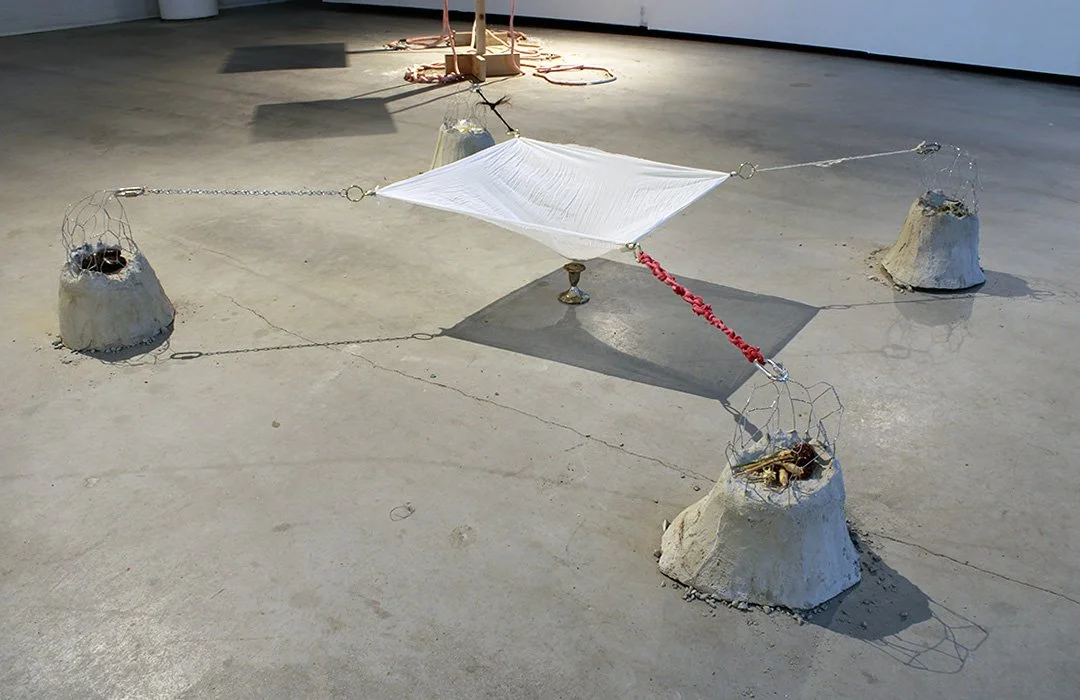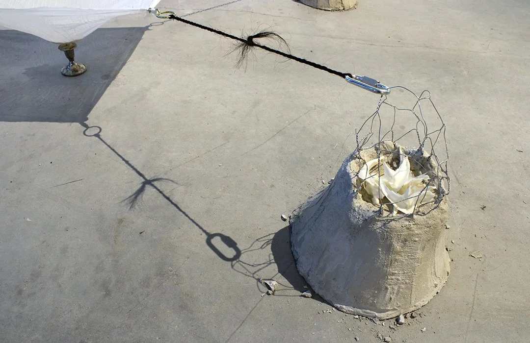concrete, wire, rope, chain, hair, fish bones, rocks, dried flowers, dried sage, candle